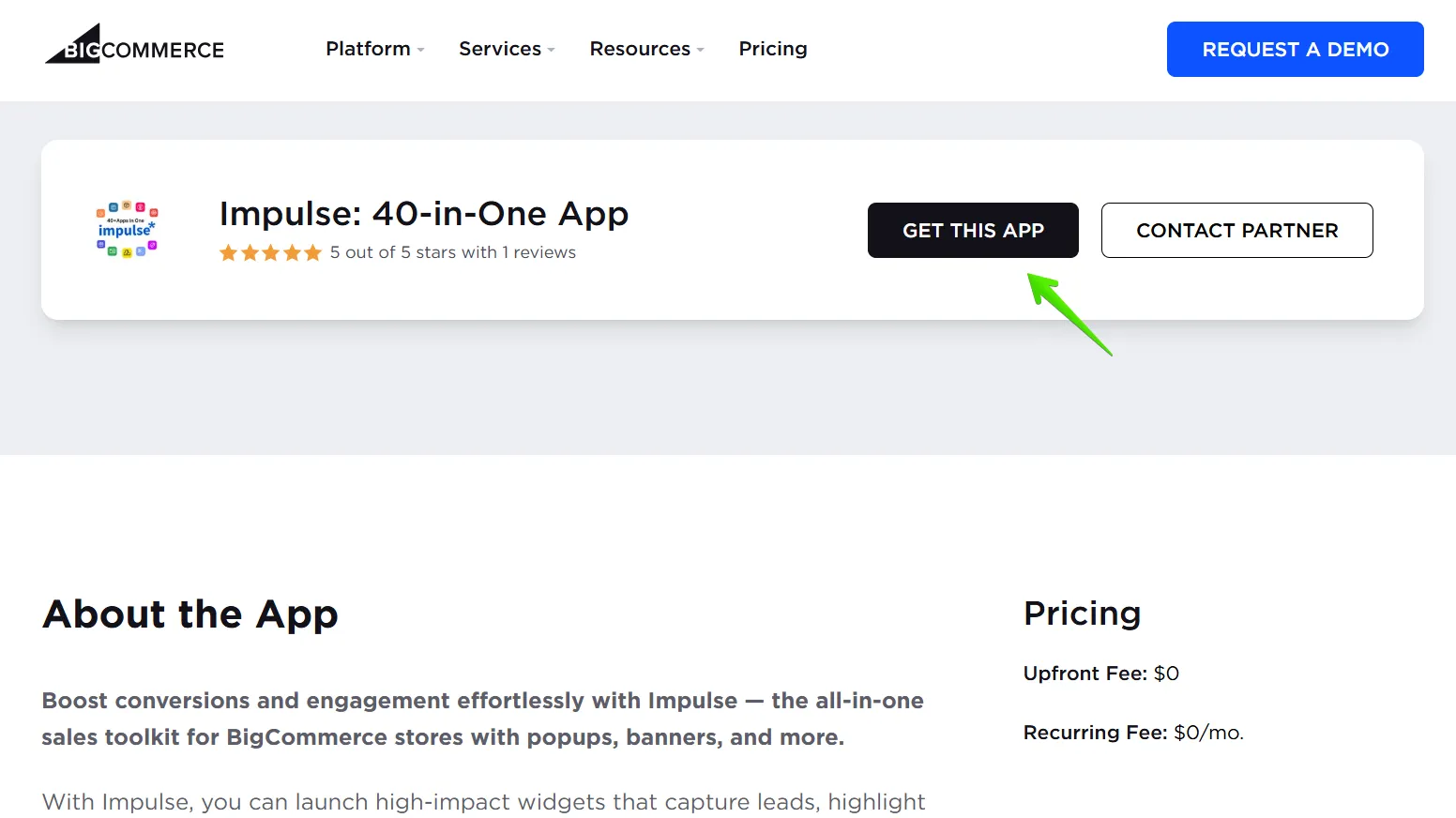 1. Go to the BigCommerce App Store, find Impulse: 40-in-One App, and click the “Get This App” button.
