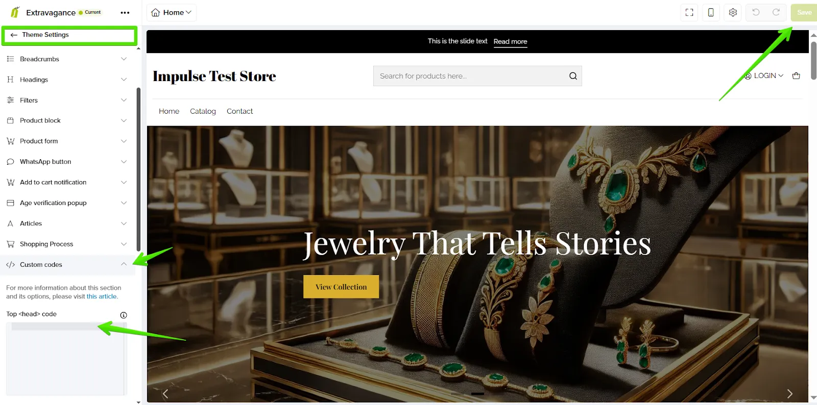8. Click on the Theme Settings and go down to the Custom Codes section. Expand it and paste your script in the first field called “Top <head> code”. Don’t forget to save the changes.