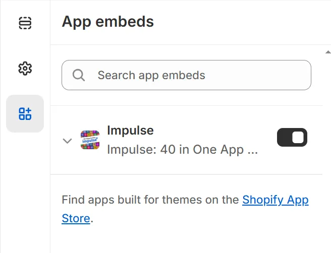 3. In the App Embeds sidebar in the editor, toggle the Impulse app switch to the "On" position.