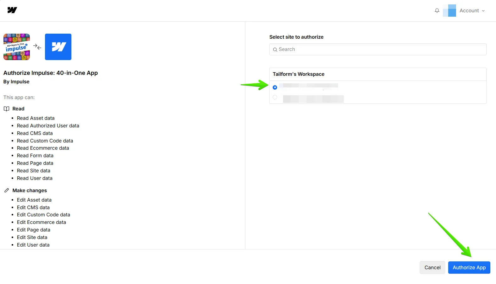 3. After logging in, you'll be redirected to the integration page. Here, choose the specific project in Webflow that you want to integrate with Impulse.